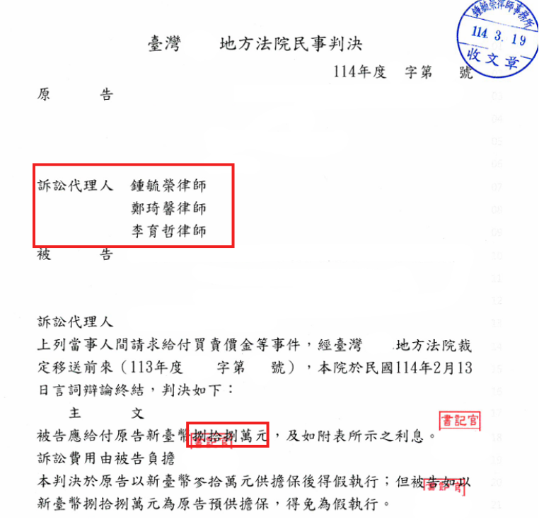 貨拿走,錢沒付?律師幫你追回!本所取得勝訴判決